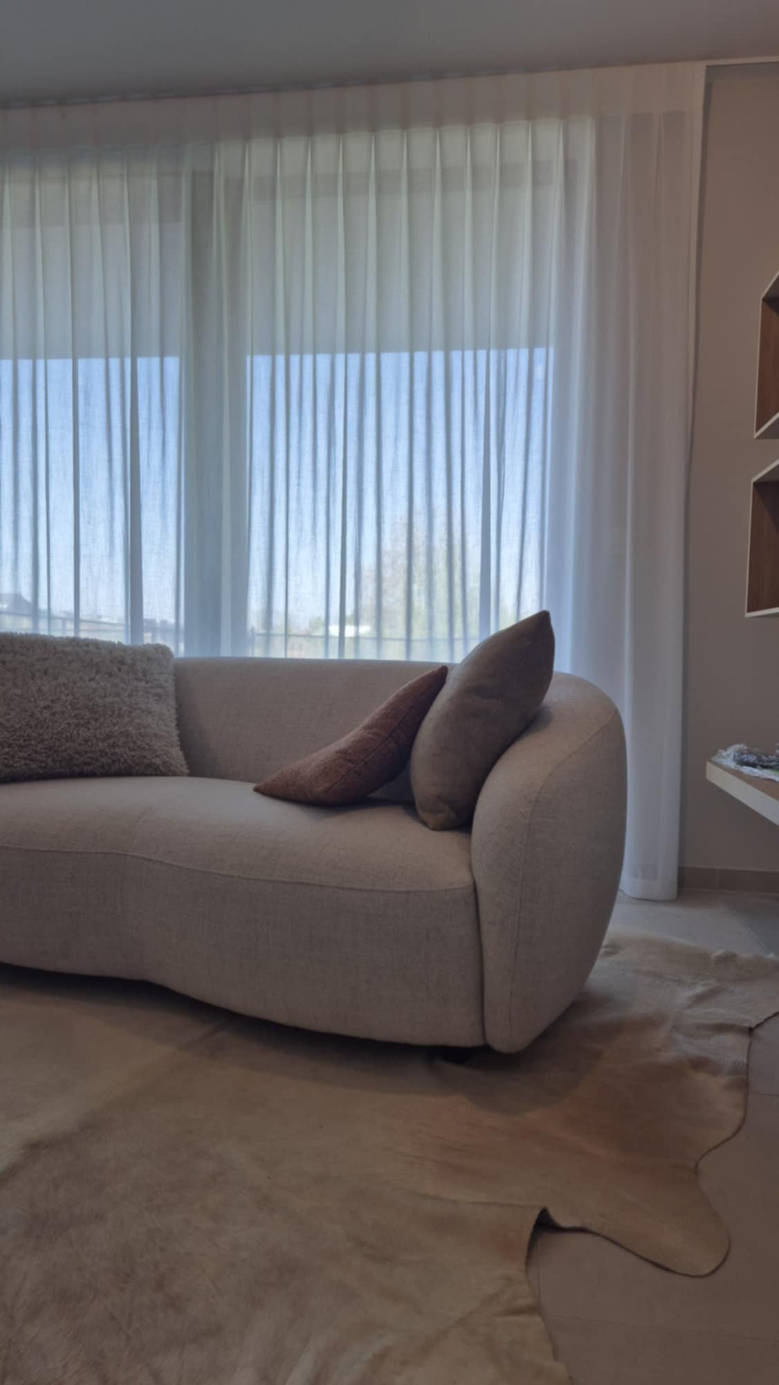 Verticale lamellen zijn vervangen door warme houten jaloezieën in combinatie met linnen gordijnen.
